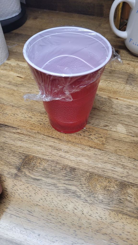 B. Carefully seal the top of the cup with plastic wrap. (Optional step: secure the plastic with a rubber band if you’re like me and bad at using plastic wrap)
