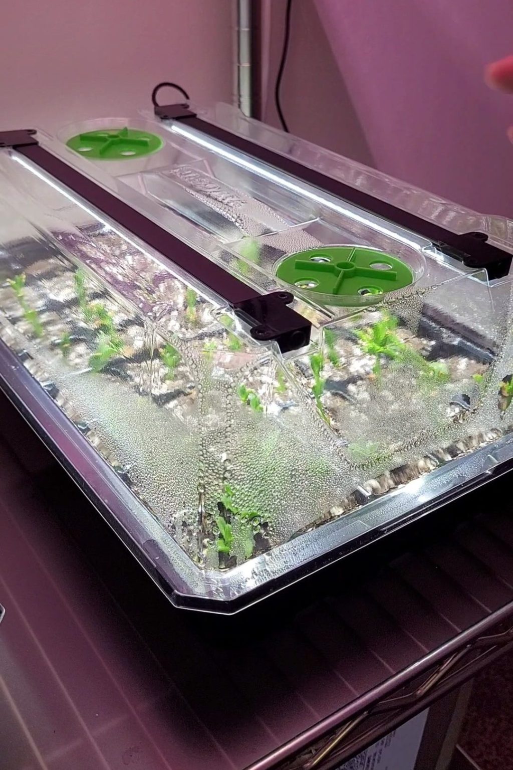 The vents on this humidity dome are simple but effective. Spin the green vent piece to adjust how much air flow gets through the openings on the dome. The integrated grow lights heat up the soil, and evaporate the water in the system, so opening these vents allows the humidity to escape quite effectively.