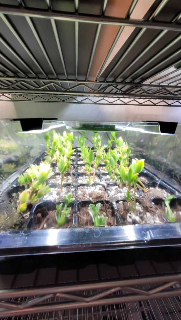 You can see a little bit of everything in this image. My 40 cell grow tray in the foreground is my experimental/ miscellaneous zone. I have three or four sets of genetics intermingled in this tray. My oldest strain is even putting off some flowers!