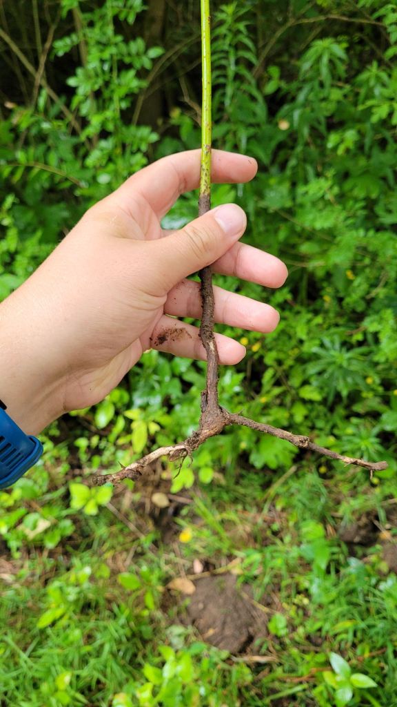 The above picture illustrates perfectly what we are looking to do. You can see the green bark of the sapling, the brown below ground section of the stem, and the horizontal root system.